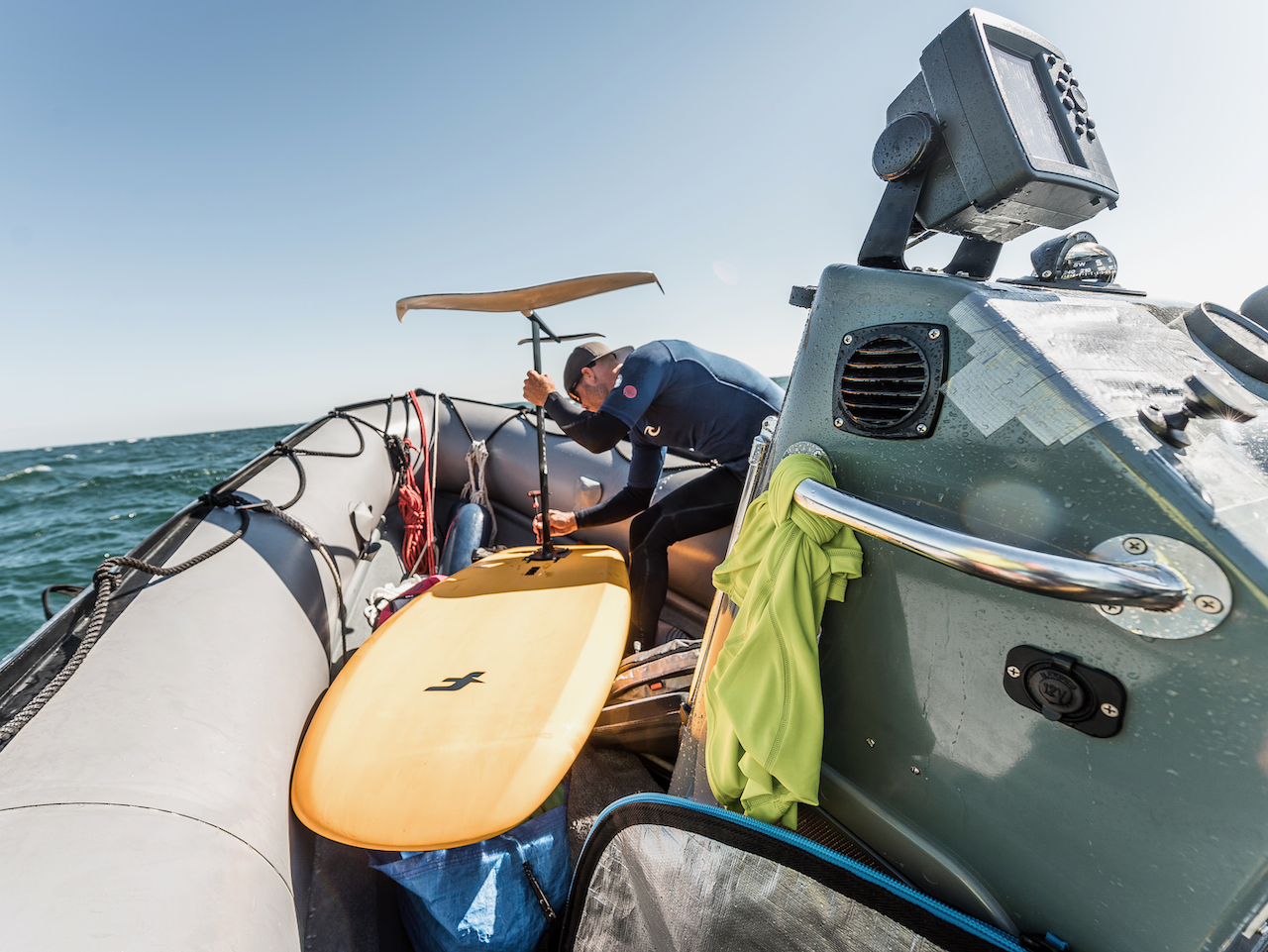 So waren wir an einem Montagmorgen entschlossen loszufahren. Der Wind pustete mit ca. 30-35 Knoten aus Nordost. Ein Sturm war es also nicht ;-) Mit unserem Schlauchboot allerdings schon sportlich. Die See war rau und an Wingfoil-Schulung war nicht zu denken. Uns ist klar, die Ostsee ist kein offener Atlantik, die Wellenhöhe und vor allem die Wellenenergie halten sich in Grenzen.
